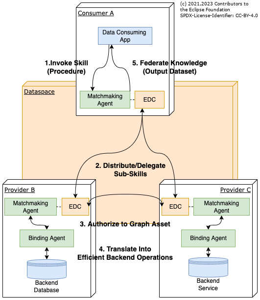 This coordinating job is taken over by the Matchmaking Agent, an endpoint that is mandatory for any KA-enabled Dataspace Participant. For that purpose, the Matchmaking Agent supports the SPARQL specification with the effect that the dataspace can be traversed as one large data structure. Hereby, the Consumer-Side Matchmaking Agent will β as driven by the builtin federation features of SPARQL - interact with the KA-enabled EDC in order to negotiate and perform the transfer of Sub-Skills (=SPARQL Contexts) to other Dataspace Participants. See the Knowledge Agents SPARQL API for detailed information.