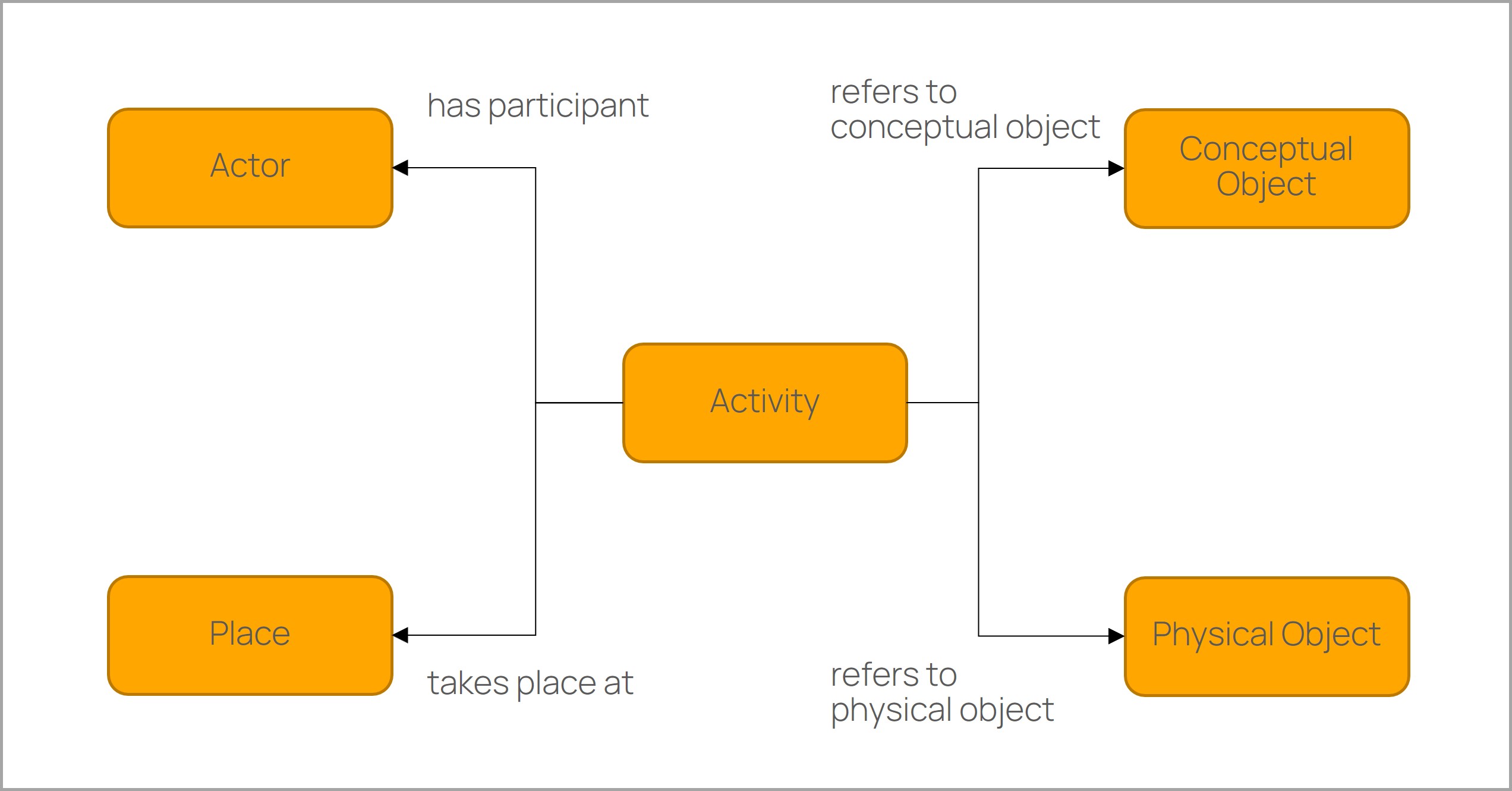 A well-known approach is the activity-centered or event-based modelling. The CIDOC CRM ontology provides this idea and the main classes based on this concept. In this approach the classes actor, place, physical object and conceptual object are connected through activities. Instead of assigning all information to the physical object. This distributed representation has several advantages: