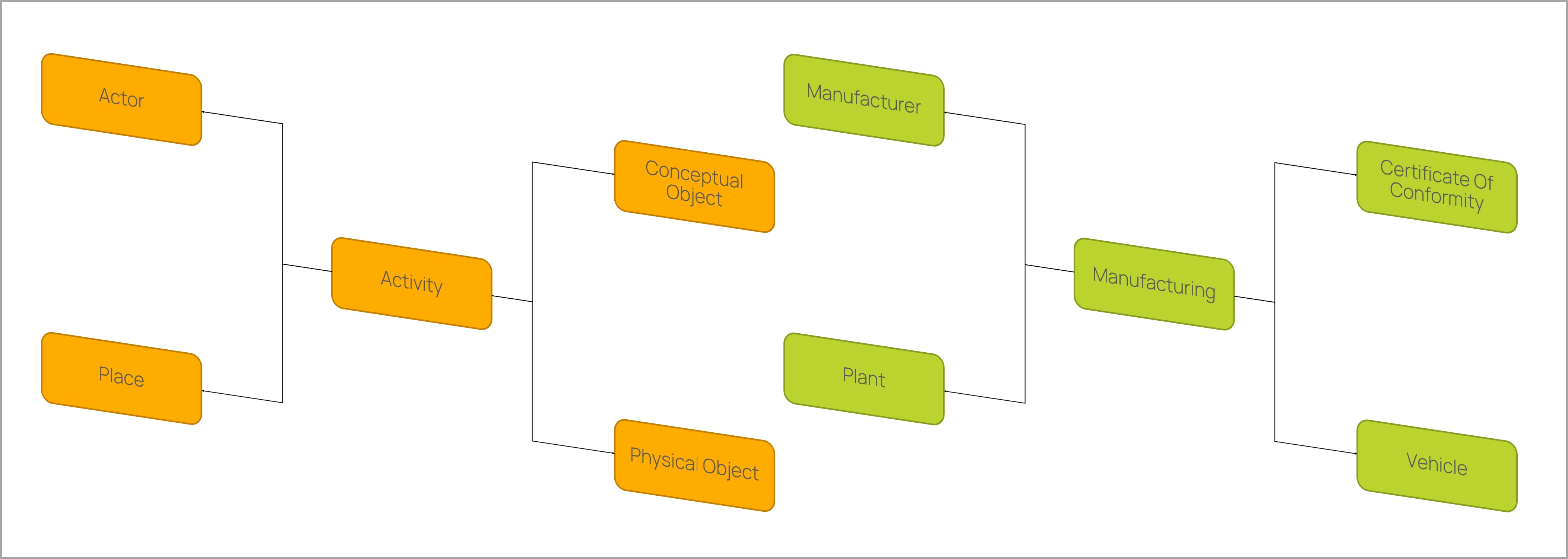 The concept described above is the basic modelling pattern in Knowledge Agent. It is called the core ontology. Based on this ontology, specific domain ontologies can be modelled. A domain ontology can be created based on subclasses (e.g. Manufacturing is SubClassOf Activity), subrelations (e.g. has Manufacturer is SubPropertyOf has Participant) and subattributes. The domain ontology has the same structure as the core ontology, but can be extended to include additional classes. The Knowledge Agent approach uses OWL 2 QL for modelling. This is a subset of OWL 2 Full. The reason for this is that it includes most of the main features of conceptual models such as UML class diagrams and ER diagrams. It also provides polynomial time inference for large data sets.