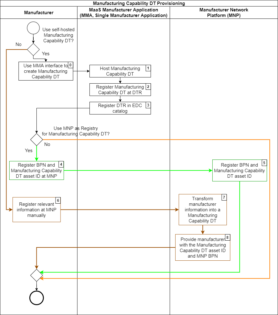 One of these use cases has been utilized to build the main scenario of CDME. This use case builds on a federated marketplace for manufacturing capabilities. For this, the manufacturer onboards their capabilities directly in the federated marketplace or on another MaaS marketplace (e.g., an on-demand manufacturing (ODM) platform) which then onboards their capabilities for them as a proxy. Capabilities include knowledge about the factories, e.g., machinery, human expertise, past production outputs and processes, capability terms like “band sawing”, certifications, etc. Buyers are further able to search for the manufacturing capabilities they require to produce a certain product (usually parts or assemblies). This can include individual manufacturing steps to cover missing capabilities in regard to existing productions or even fully external production offers. Both the ODM platform and the marketplace can perform the necessary matchmaking between required and offered capabilities. Usually, the ODM platforms offer the production of a certain part and often act as manufacturers, whereas the marketplace only offers the production by an arbitrary number of manufacturers. However, both may use additional IT or engineering services to provide their customers with added values such as feasibility analysis or optimization for cost reduction. Moreover, marketplaces can build hierarchies within themselves or with ODM platforms. This is the case in Catena-X, where a marketplace not only offers manufacturing capabilities registered directly by the manufacturers, but also capabilities registered with ODM platforms. In consequence, a network of networks is built which connects different networks of manufacturers (according to their capabilities) and offers multiple layers of monetization and added value. This approach enables a single-entry point to the network of networks via the marketplace.